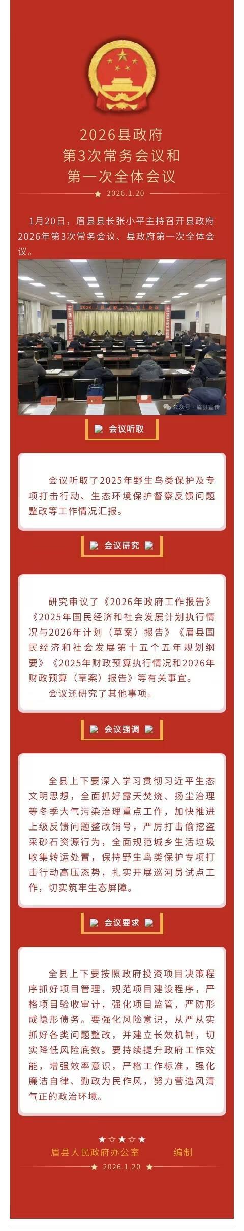 原文链接:眉县政府召开2026年第3次常务会议、县政府第一次全体会议