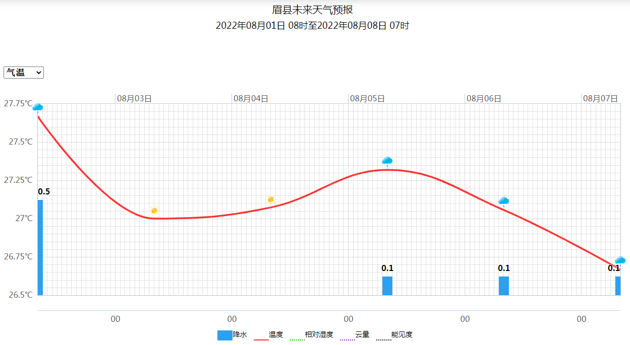 上周周平均气温27.5℃,最高气温33.8℃,出现在7月25日。27日出现雷阵雨,累计雨量7.9mm。