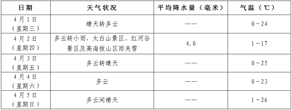受低槽东移影响,预计4月2—3日我县有一次降雨降温吹风天气过程。其中,4月2日多云转小雨,太白山景区、红河谷景区及高海拔山区雨夹雪,过程平均降水量4毫米,局地8毫米以上。过程期间日平均气温下降4℃左右,过程最低气温4℃出现在4日清晨,太白山景区、红河谷景区及高海拔山区0℃。同时,2日夜间至3日全县有4~5级偏北风,太白山景区、红河谷景区及高海拔山区阵风可达8级以上,并伴有浮尘和扬沙天气。