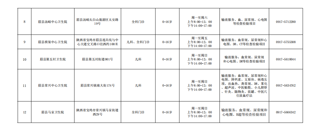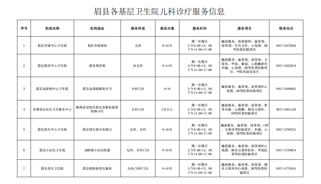 为积极应对秋冬季呼吸疾病,进一步方便儿童患者就医,现将眉县各基层卫生院(社区卫生服务中心))儿科诊疗服务信息予以公布。