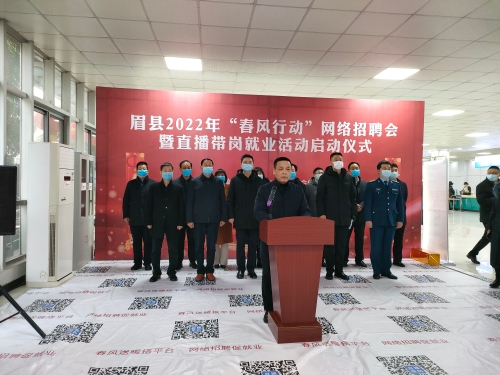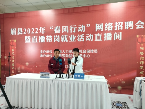 春风沐浴新气象,就业送岗暖人心。2月8日上午,由眉县人民政府主办,眉县人社局、劳动就业服务中心和宝鸡第一人才网承办的眉县2022年“春风行动”网络招聘会暨直播待岗就业活动在市民中心成功举办。县人社局局长、党委书记李仓林主持了启动仪式。