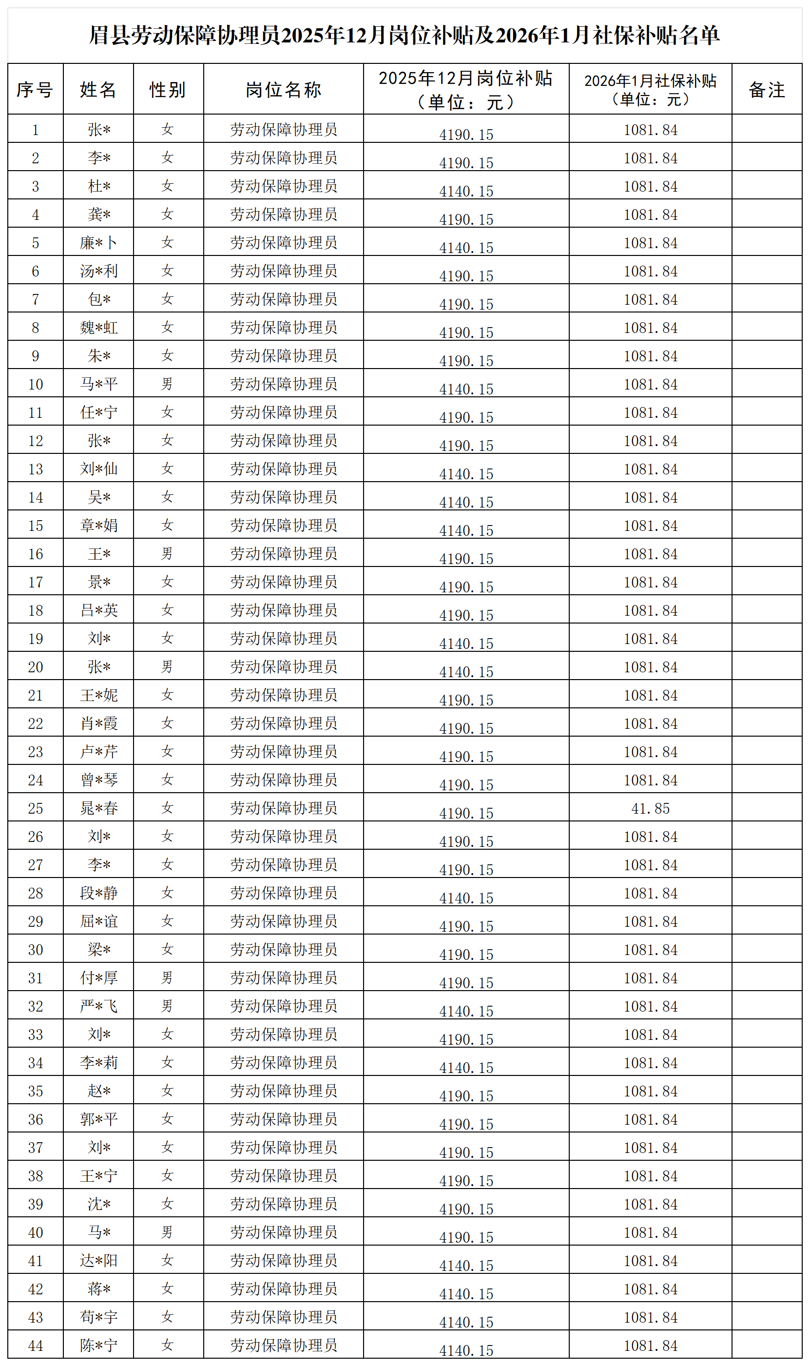 根据市财政局、人社局《关于印发<宝鸡市就业补助资金管理实施细则>的通知》(宝鸡市财办社〔2021〕年6号)精神,现将我县劳动保障协理员2025年12月份岗位补贴及2026年1月份社保补贴情况予以公示。