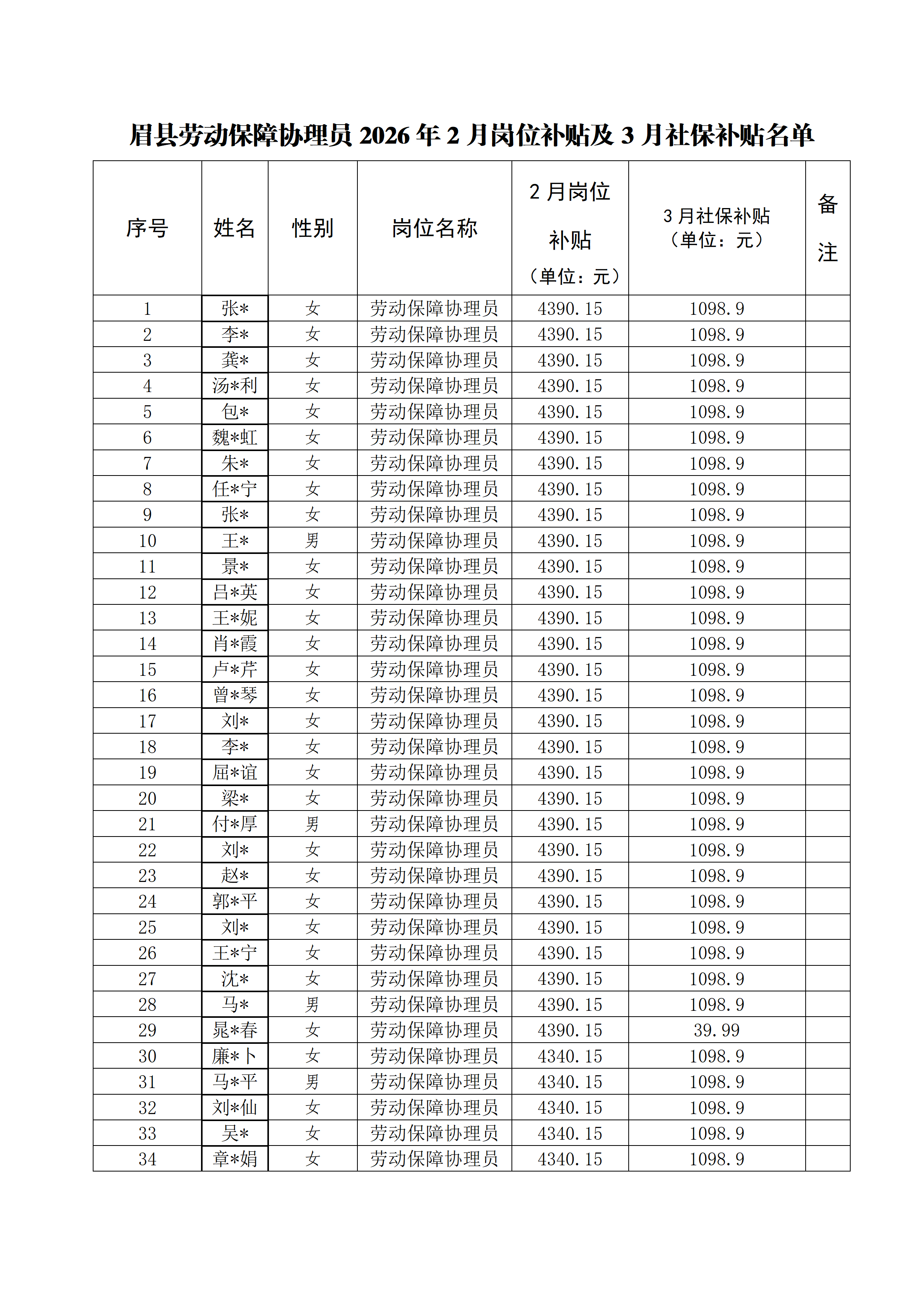 根据宝鸡市财政局、人力资源和社会保障局《关于调整劳动保障协理员岗位补贴标准通知》(宝人社发〔2026〕3 号)文件精神及要求,现将劳动保障协理员2026年2月岗位补贴、3月社保补贴及保险新增部分予以公示。