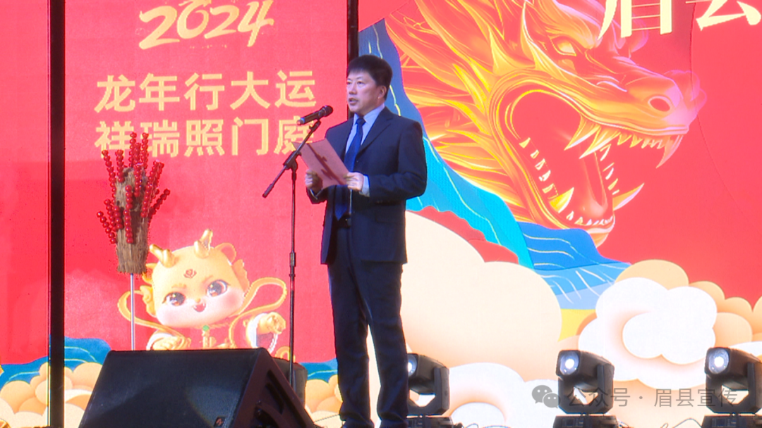 本场晚会由中共眉县县委、眉县人民政府主办,眉县县委宣传部、眉县文化和旅游局、眉县融媒体中心承办。眉县县委常委、宣传部部长麻承志发表致辞,他表示,在刚刚过去的2023年,眉县经济社会呈现出“稳中有进、持续向好”的发展态势,实现了质的有效提升和量的合理增长,眉县的知名度、美誉度、影响力得到了更进一步放大和拔高。2024年是新中国成立75 周年,也是推动“五个眉县”建设的关键一年。在全县广大党员干部群众的共同努力下,在33万父老乡亲的鼎力支持下,眉县一定能干出新气象,干出新篇章,干出新局面,把“五个眉县”建设推向更高水平,以更加优异的成绩向新中国成立75周年献礼!