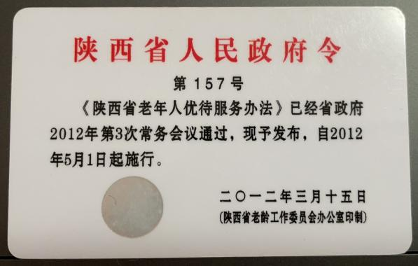 法律依据:陕西省人民政府令(第157号)《陕西省老年人优待服务办法》