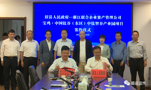 签约仪式上,孙伟介绍了中钛智谷产业园项目情况;浙江中小企业联合资产管理有限公司董事长陈贵福介绍了项目规划及预期经济效益;张小平代表眉县与浙江中小企业联合资产管理有限公司签订了投资协议。