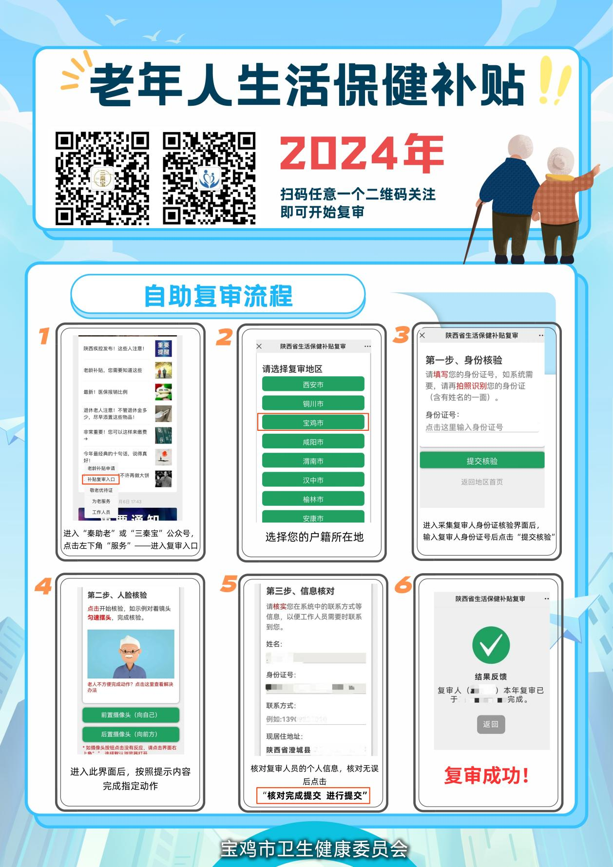 主要采取手机自行复审的方式,通过关注“秦助老”或“三秦宝”微信公众号,进入“服务”-“补贴复审入口”,按提示完成复审。