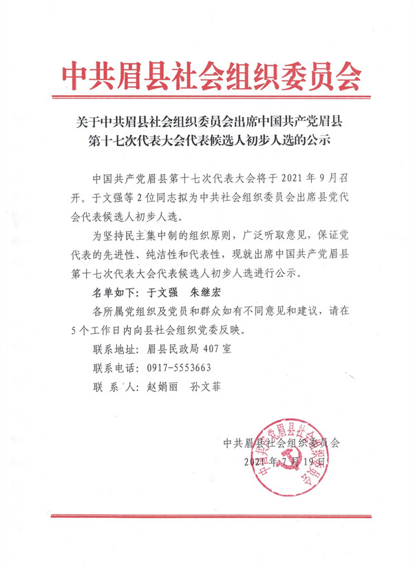 现将于文强、朱继宏2位同志拟为中共社会组织委员会出席中国共产党眉县第十七次代表大会代表候选人初步人选公示如下:
