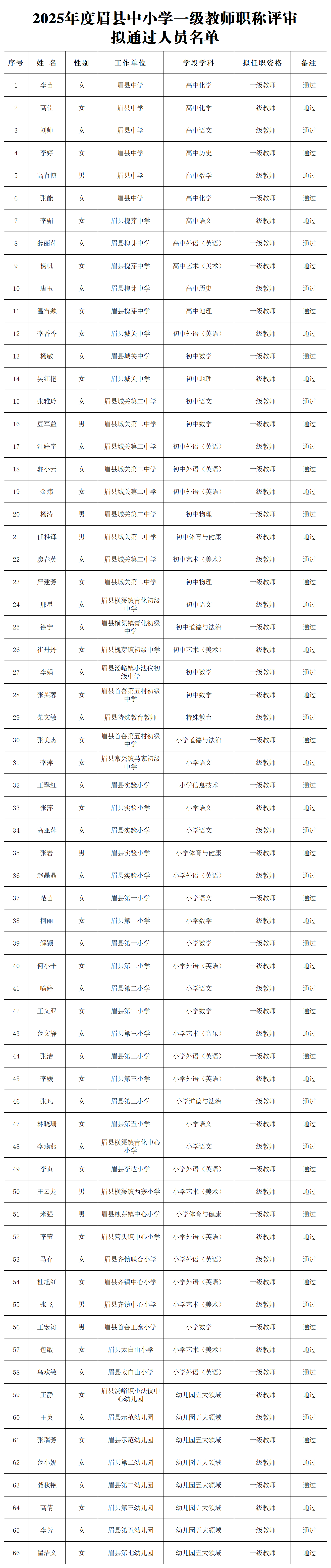经眉县中小学一级教师评委会评审,李苗等66名同志具备中小学一级教师任职资格,现予以公示。公示期5个工作日,从2025年10月23日至10月29日。