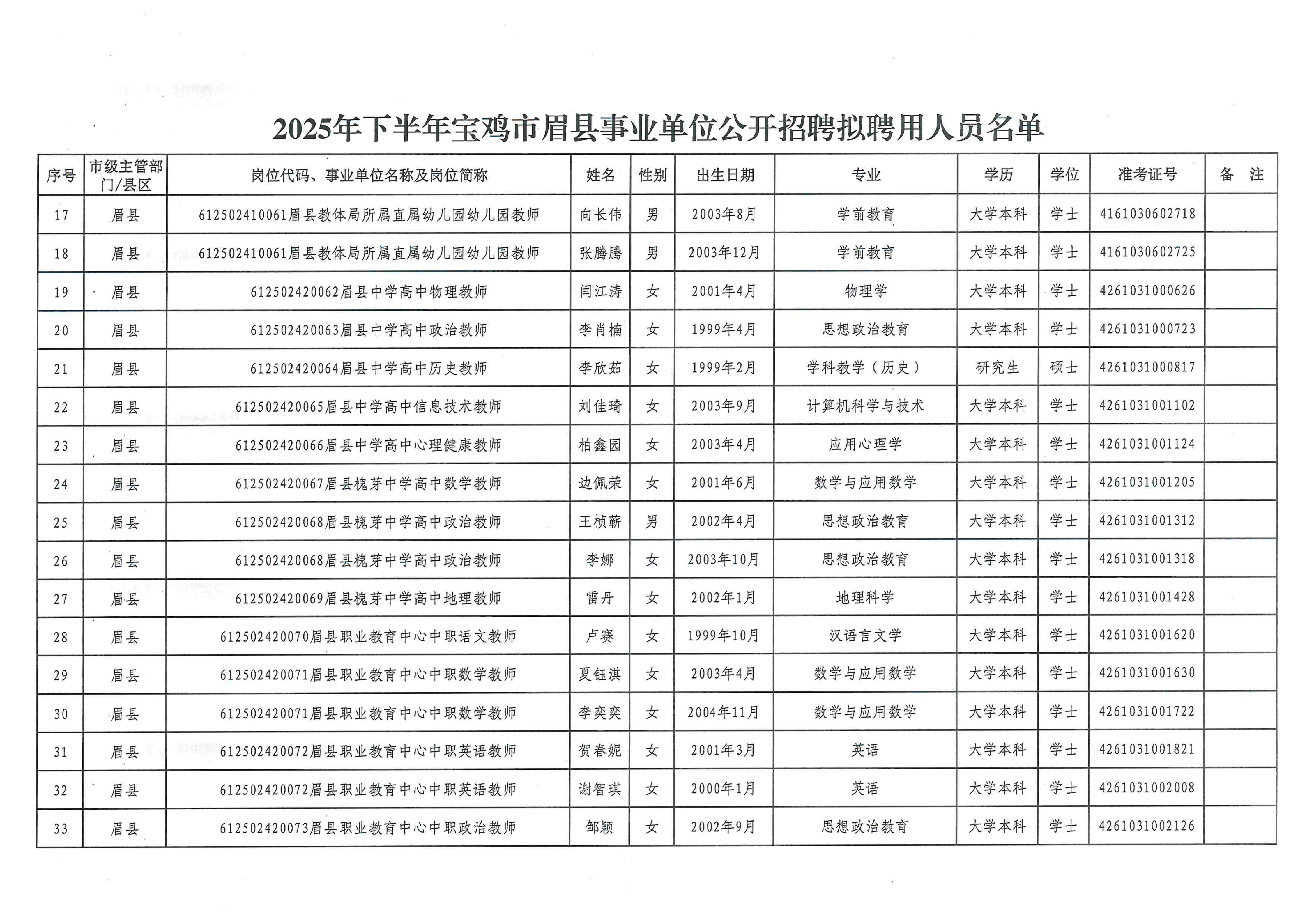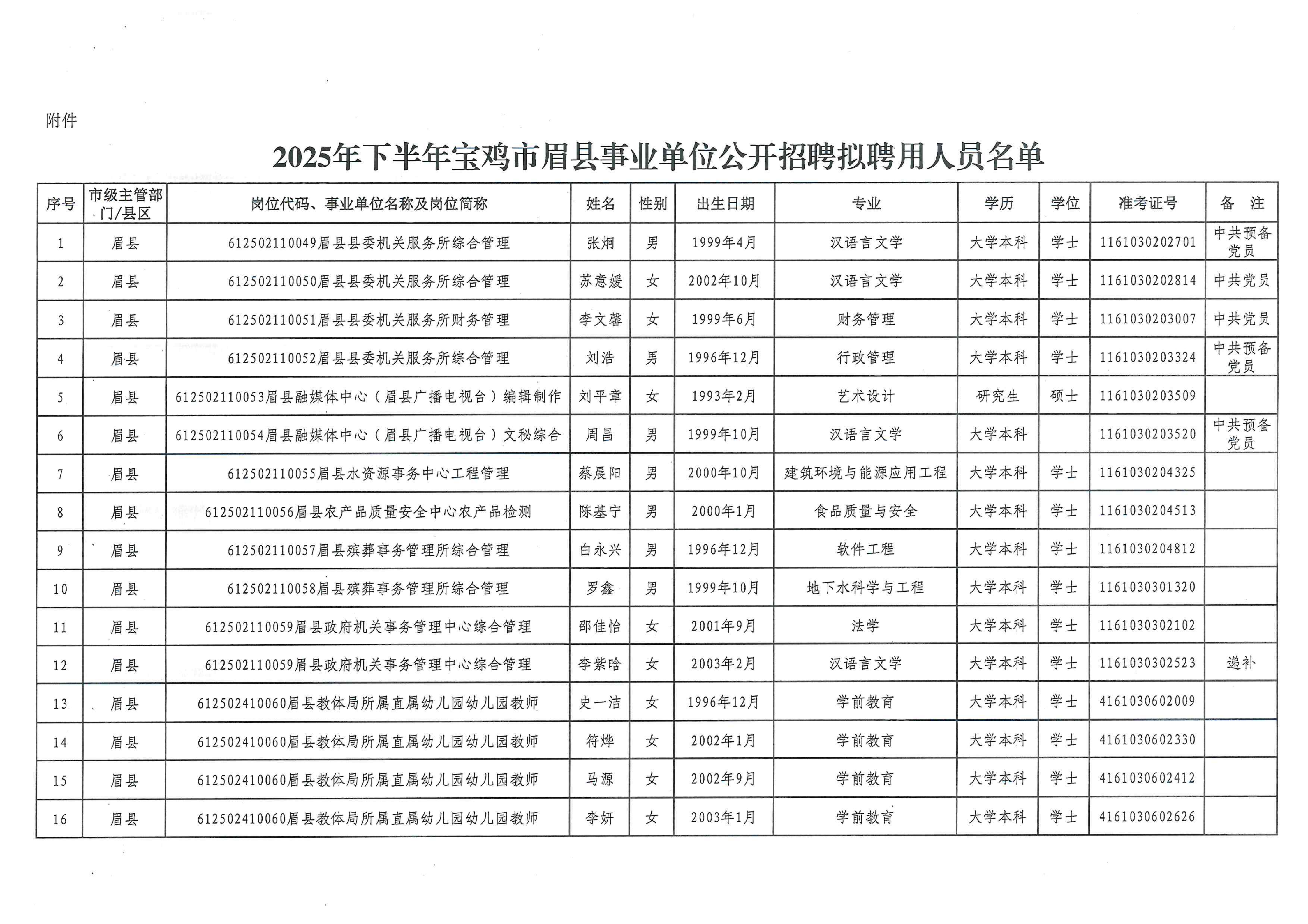 附件:2025年下半年宝鸡市眉县事业单位公开招聘拟聘用人员名单