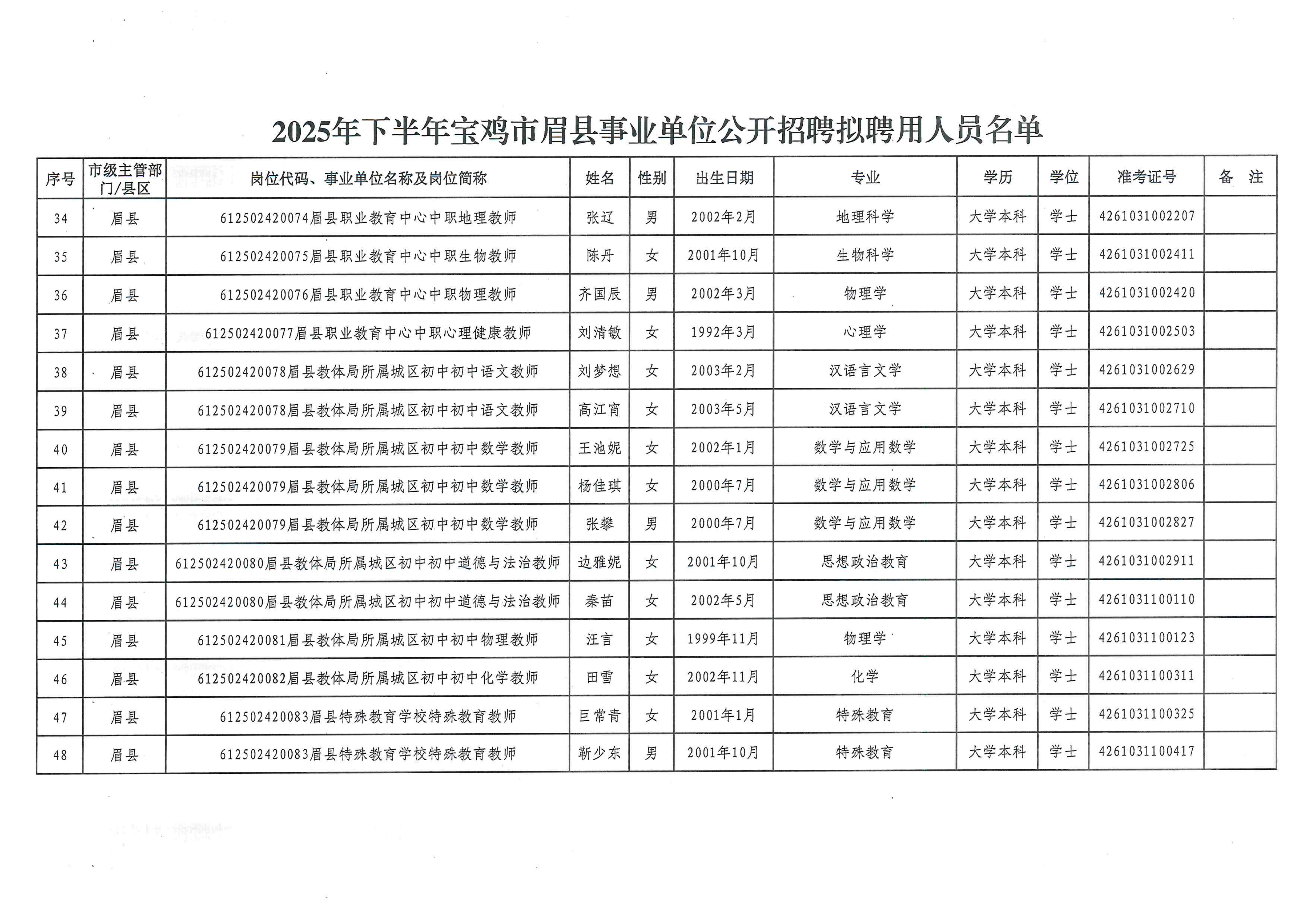 2025年下半年宝鸡市眉县事业单位公开招聘拟聘用人员
