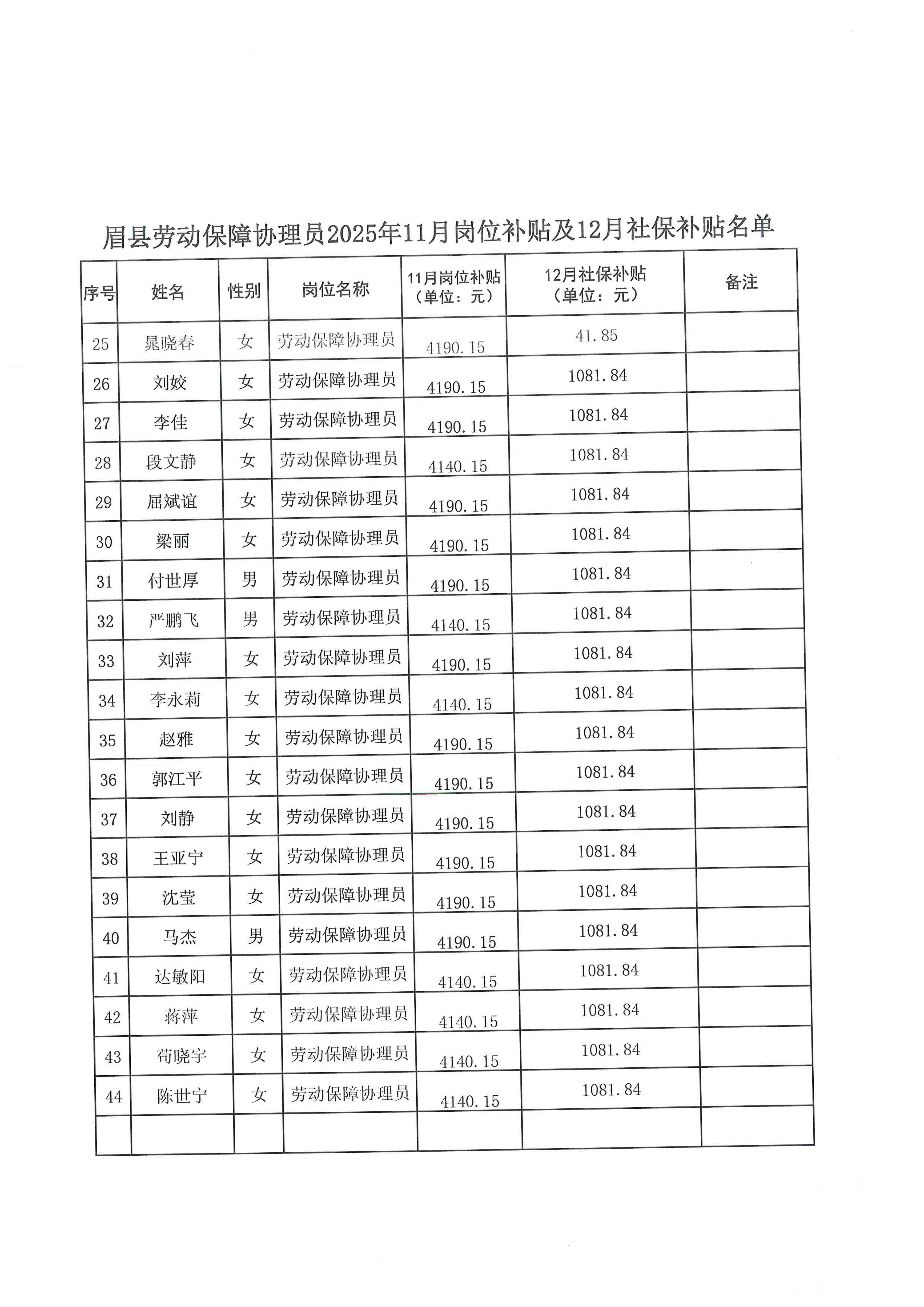 附件:眉县劳动保障协理员2025年11月岗位补贴及12月份社保补贴名单