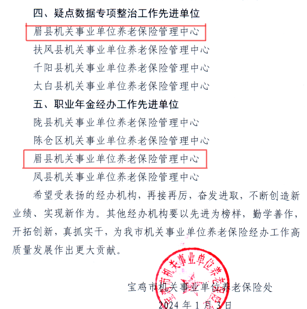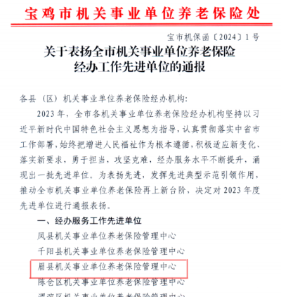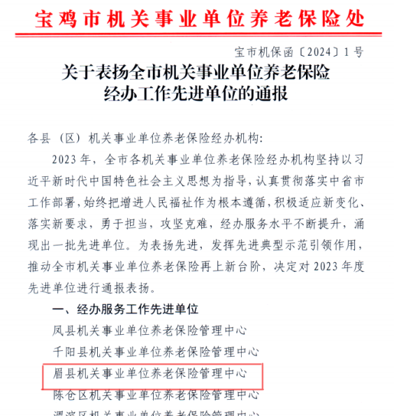 近年来,眉县机关事业单位养老保险管理中心创新经办模式,减环节、优流程、压时间、增便利,以保障和改善民生为目标,高效、稳步推进各项工作,全年参保登记10256人,完成目标任务的101%;累计征收养老保险费13651万元,累计发放退休待遇28323.1万元;职业年金收缴8096.25万元,上解8237.7万元;社保卡零星制卡总数3444张,全县累计持卡达到28.56万人。