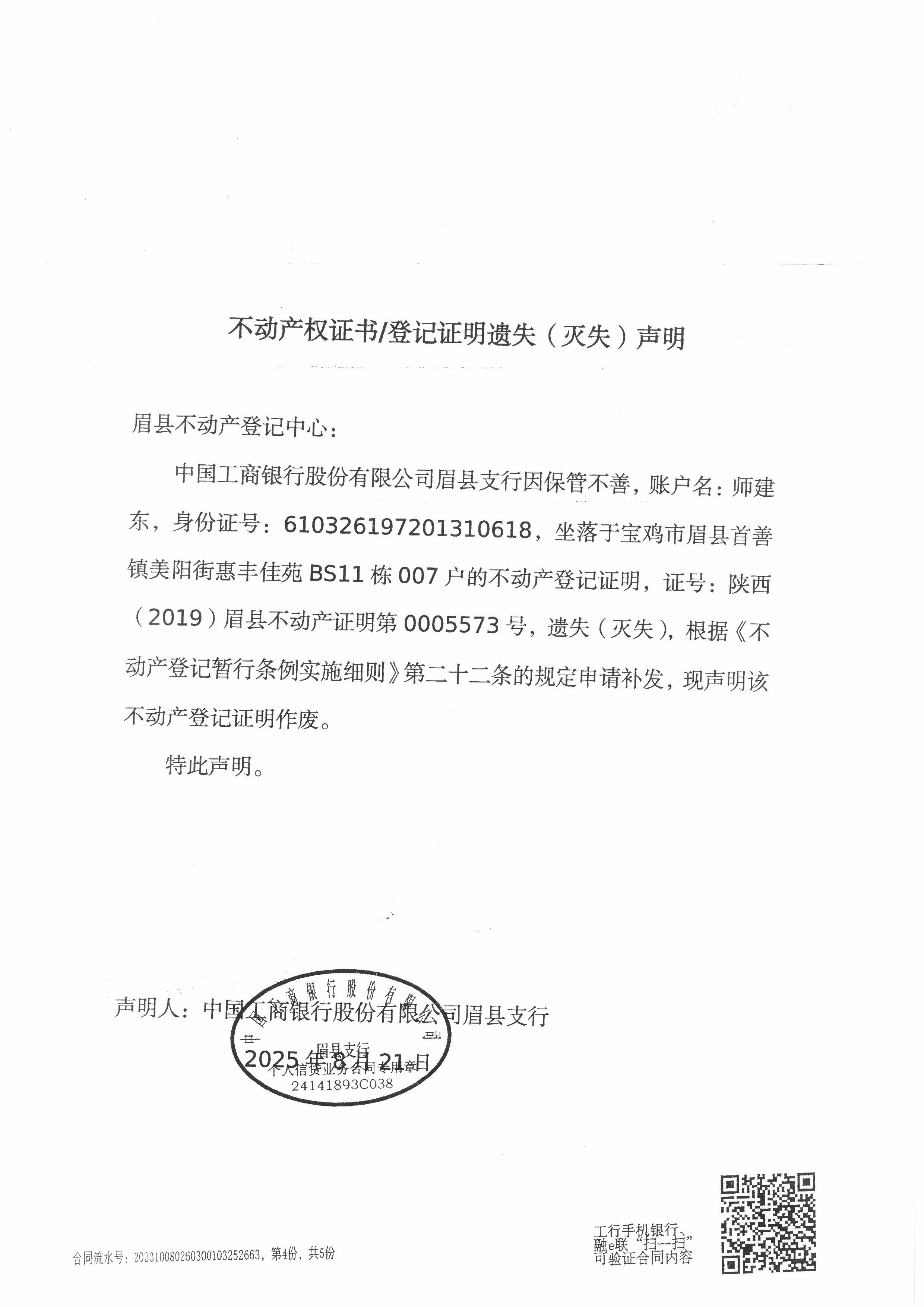 编号:(2025)第161号 遗失挂失公告 (中国工商银行股份有限公司眉县支行)