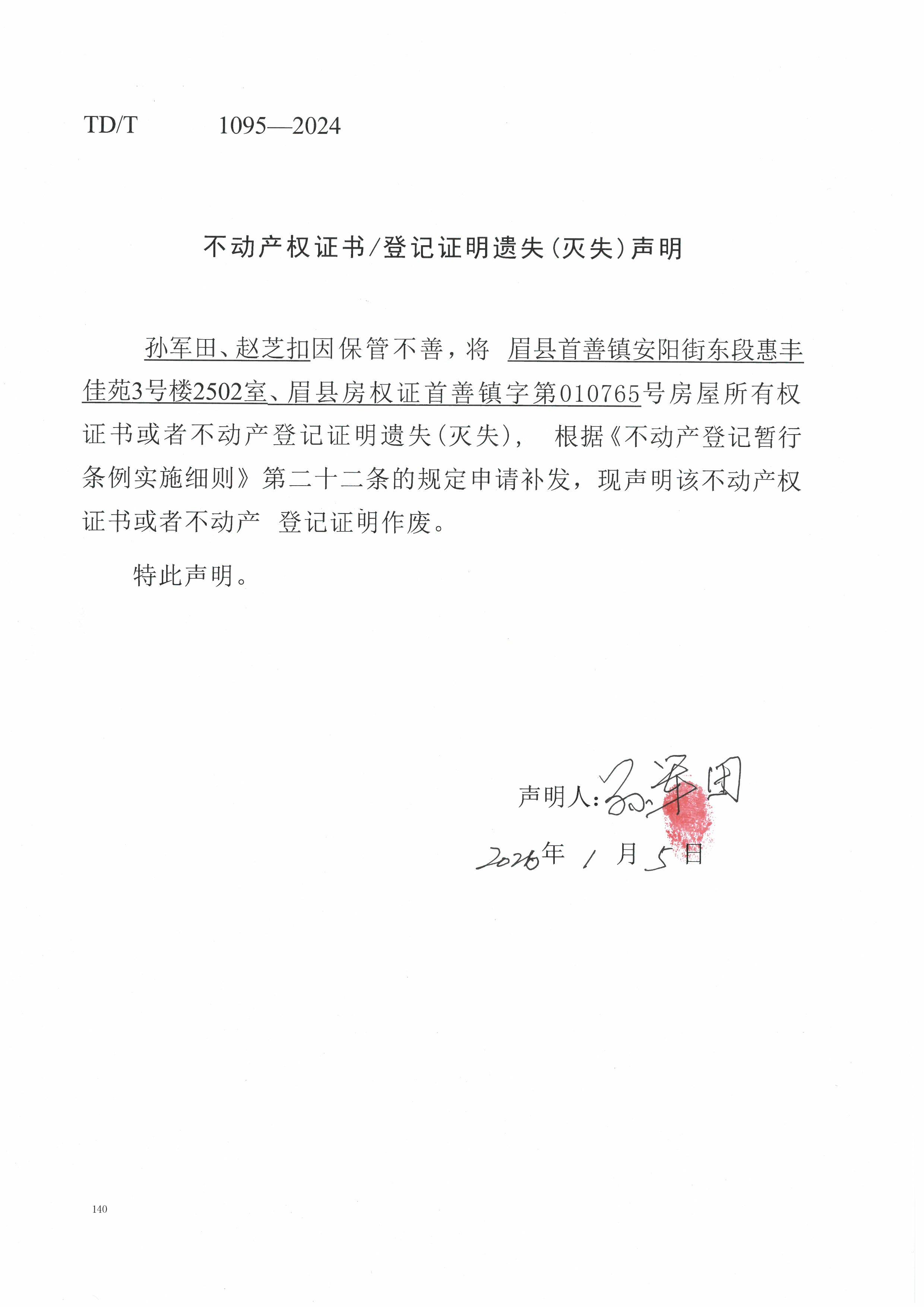 编号:(2026)第002号 遗失挂失公告(孙军田)