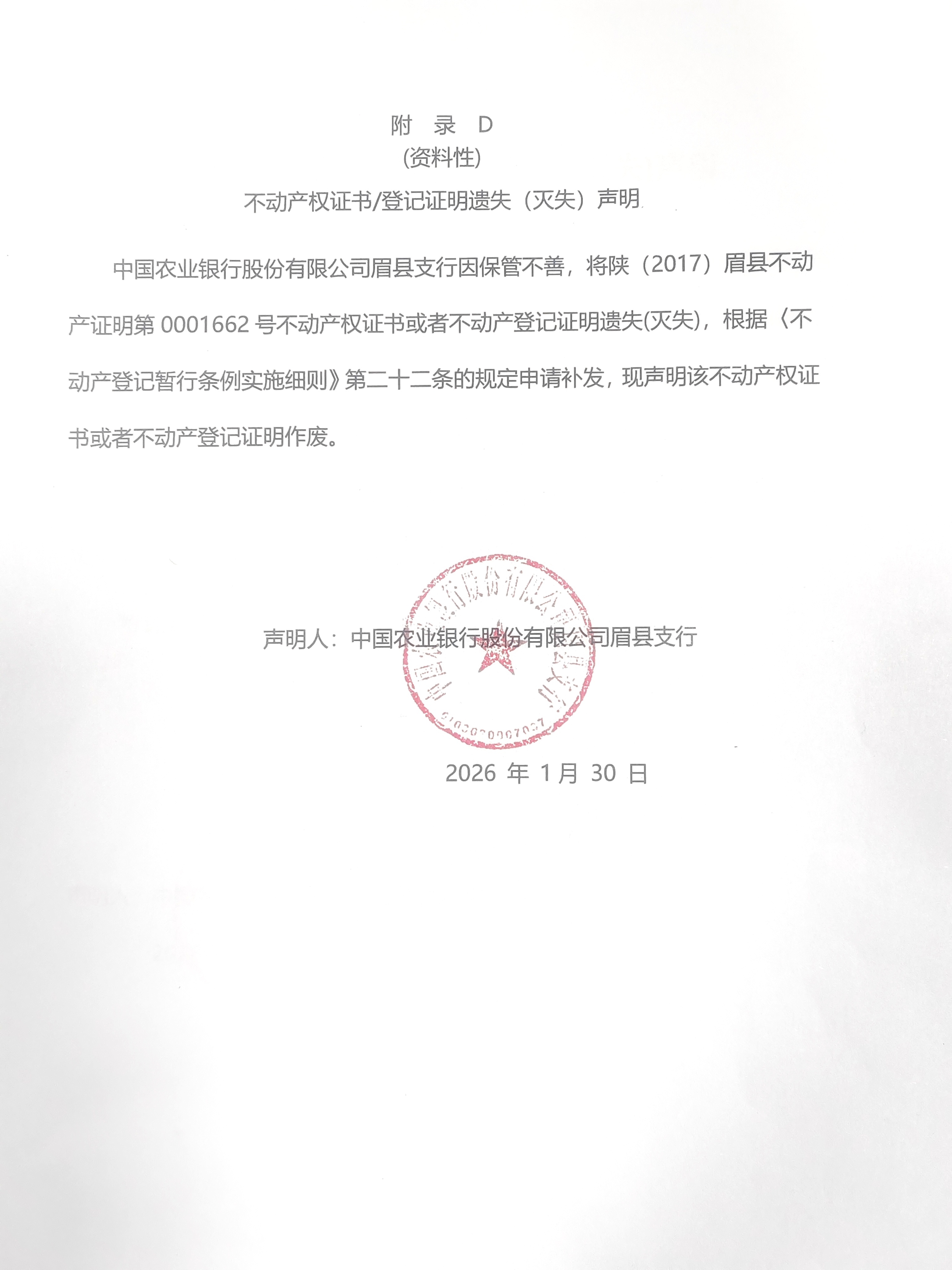 编号:(2026)第010号 遗失挂失公告(中国农业银行股份有限公司眉县支行 )