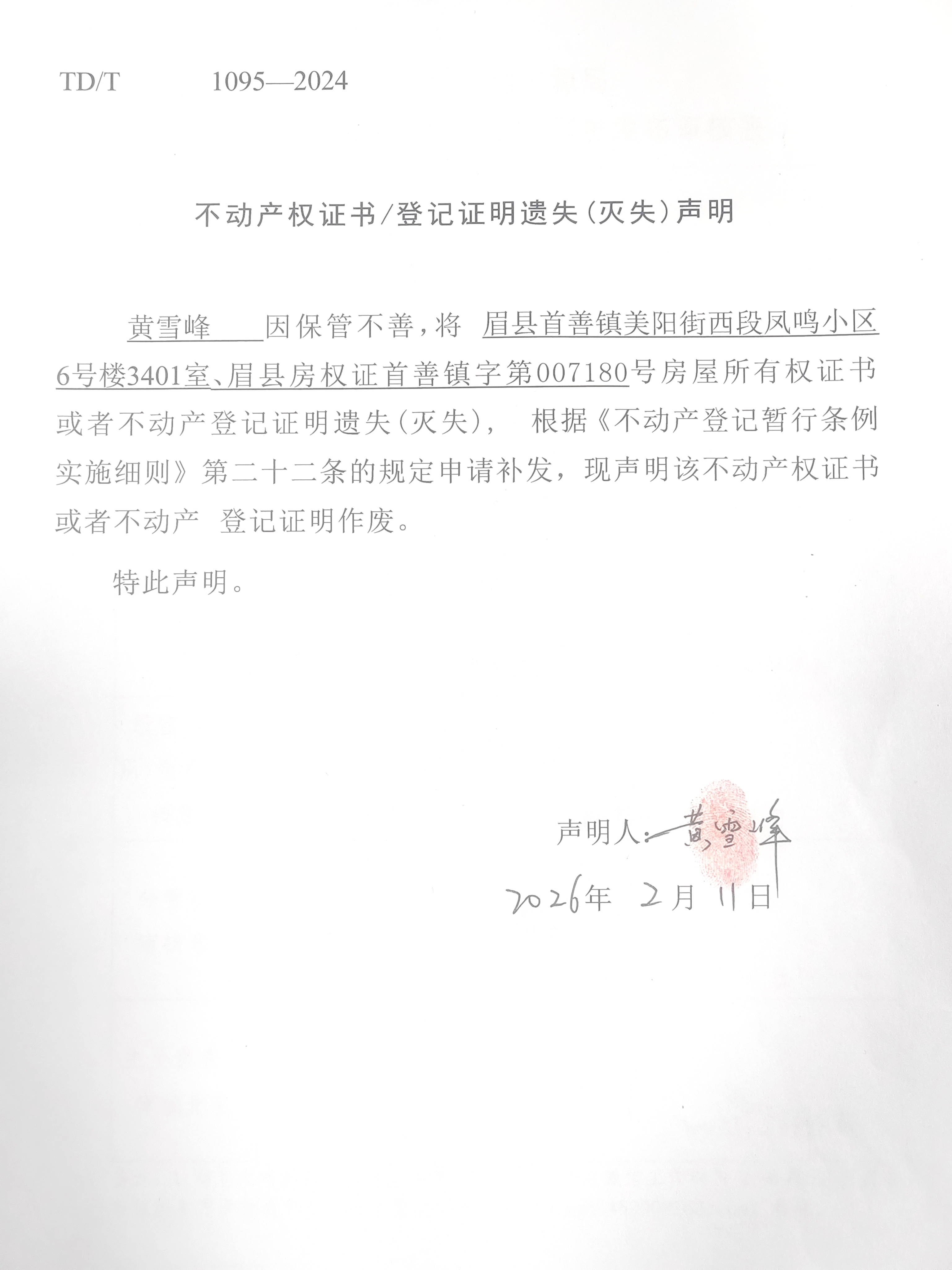 编号:(2026)第011号 遗失挂失公告(黄雪峰)