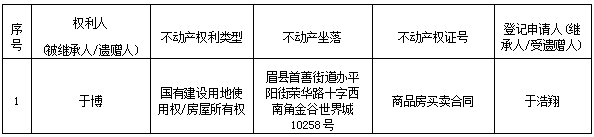 根据《不动产登记暂行条例实施细则》第十四条的规定,经初步查验,不动产登记机构拟对下列不动产权利办理不动产继承登记。根据《不动产登记暂行条例实施细则》第十七条的规定,现予公告。如有异议,请自本公告之日起 30 日内,将异议书面材料送达不动产登记机构。逾期无人提出异议或者异议不成立的,不动产登记机构将予以登记。