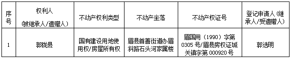 根据《不动产登记暂行条例实施细则》第十四条的规定,经初步查验,不动产登记机构拟对下列不动产权利办理不动产继承登记。根据《不动产登记暂行条例实施细则》第十七条的规定,现予公告。如有异议,请自本公告之日起 30 日内,将异议书面材料送达不动产登记机构。逾期无人提出异议或者异议不成立的,不动产登记机构将予以登记。