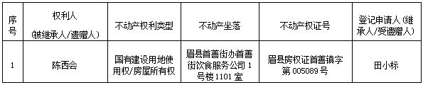 根据《不动产登记暂行条例实施细则》第十四条的规定,经初步查验,不动产登记机构拟对下列不动产权利办理不动产继承登记。根据《不动产登记暂行条例实施细则》第十七条的规定,现予公告。如有异议,请自本公告之日起15个工作日内,将异议书面材料送达不动产登记机构。逾期无人提出异议或者异议不成立的,不动产登记机构将予以登记。