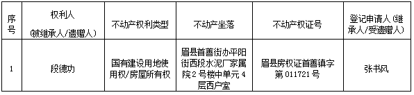 根据《不动产登记暂行条例实施细则》第十四条的规定,经初步查验,不动产登记机构拟对下列不动产权利办理不动产继承登记。根据《不动产登记暂行条例实施细则》第十七条的规定,现予公告。如有异议,请自本公告之日起15个工作日内,将异议书面材料送达不动产登记机构。逾期无人提出异议或者异议不成立的,不动产登记机构将予以登记。